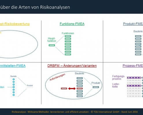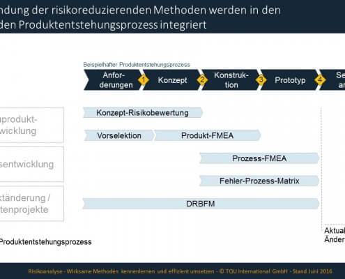 Damit die Risikoreduzierung tatsächlich erfolgreich durchgeführt werden kann, bedarf es zum einen der Kenntnis über manche vielleicht noch besser passende Methode. Z.B. die DRBFM eine Methode von Toyota, für die Analyse von Risiken in Produktänderungen oder die Konzeptrisikobewertung (KRB), die in einer sehr frühen Phase einer Entwicklung schon Risiken kostengünstig aufzeigen kann.