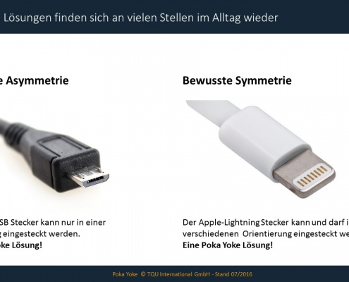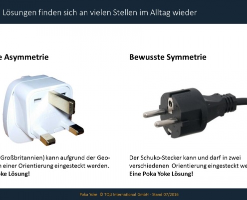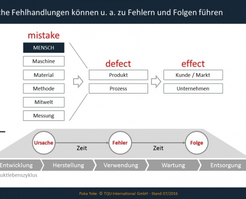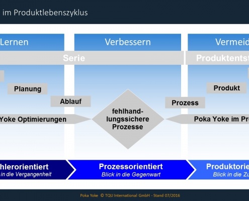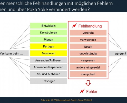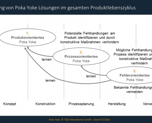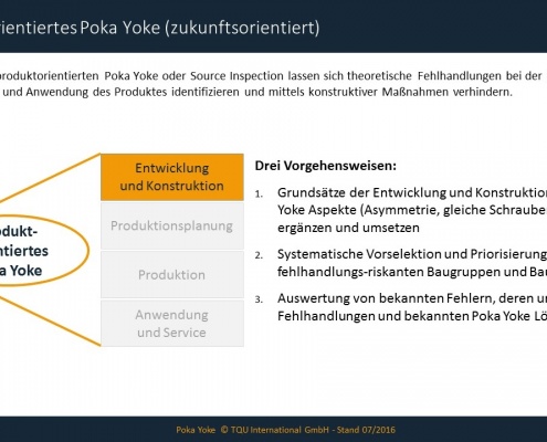 • Produktorientiertes Poka Yoke (zukunftsorientierte Ausrichtung): In der Entwicklungsphase werden theoretische Fehlhandlungen in den unterschiedlichen Lebensphasen eines Produktes identifiziert und über konstruktive Maßnahmen verhindert