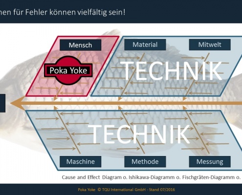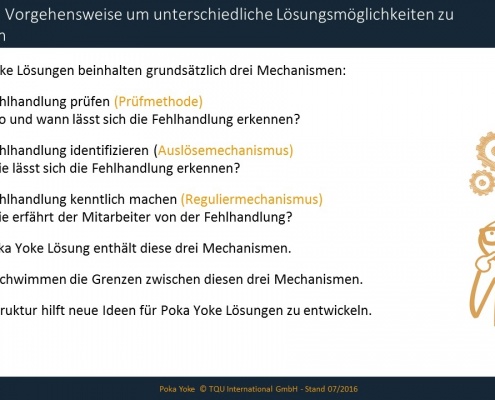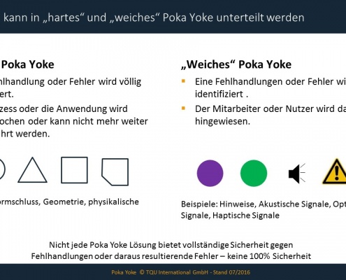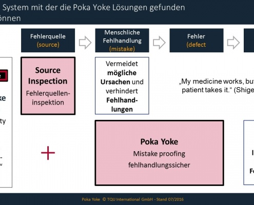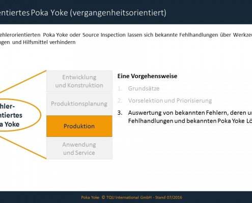 • Fehlerorientiertes Poka Yoke (vergangenheitsorientierte Ausrichtung): Es werden bekannte Fehler analysiert, die Fehlhandlung identifiziert und in den bestehenden Prozessen über Vorrichtungen, Werkzeuge und Hilfsmittel verhindert
