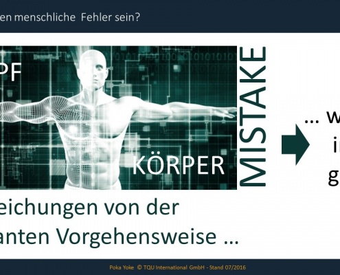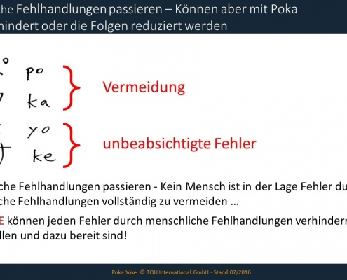 Ausgangsbasis für Poka Yoke ist die Erkenntnis, dass kein Mensch in der Lage ist, unbeabsichtigte Fehler bzw. menschliche Fehlhandlungen vollständig zu vermeiden. Mit Poka Yoke wird meist durch eine einfache und wirkungsvolle Lösung dafür gesorgt, dass diese menschlichen Fehlhandlungen (mistake) im Fertigungsprozess nicht zu Fehler (defect) am Produkt führen.
