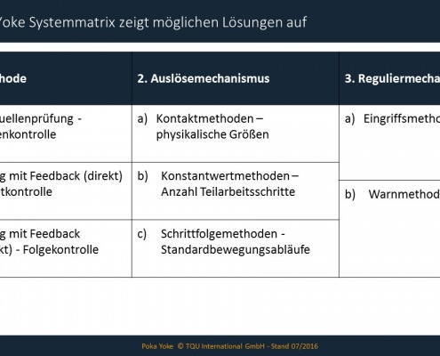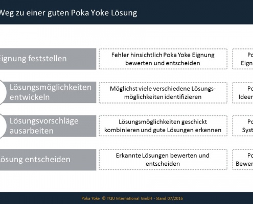 Die Umsetzer des TQU haben eine Vorgehensweise für die Einführung von Poka Yoke entwickelt und diese bei Automobilherstellern und einer Vielzahl von anderen Unternehmen eingeführt.